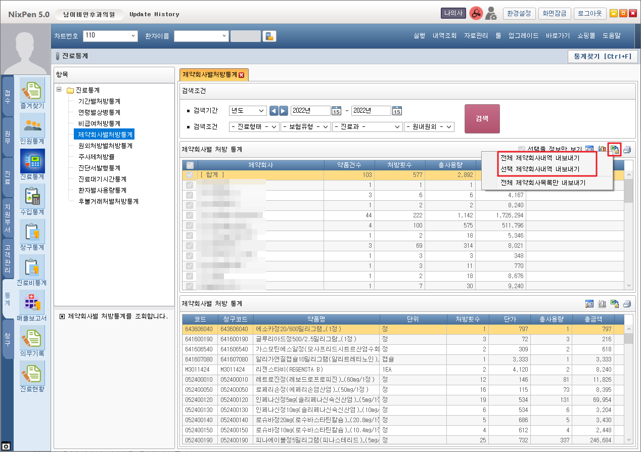 1) 진료통계.[제약회사별처방통계] 화면 참조