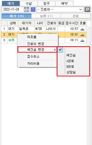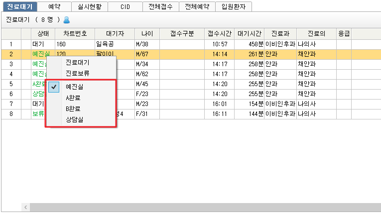 2) 대기자의 [상태] 항목 값 Right Click 시 [예진실] 목록 메뉴 팝업