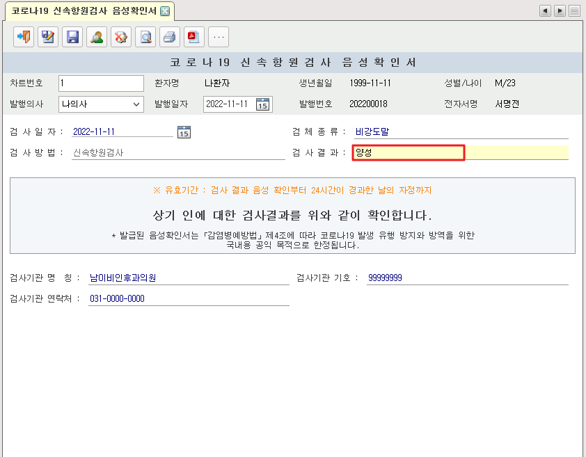 진단서 - 코로나19 신속항원검사 음성확인서 검사결과 변경기능 추가