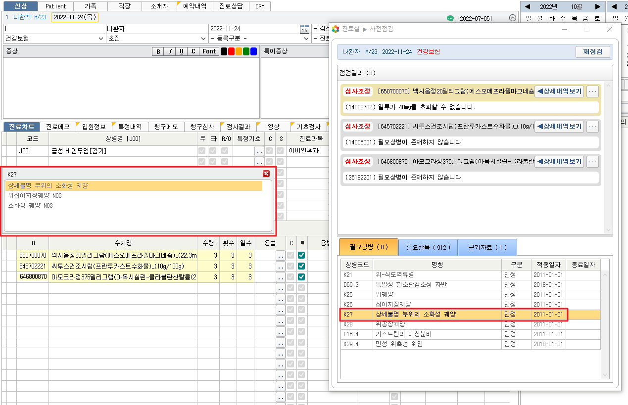 4) 사전점검 창 하단의 [필요상병] 탭 목록 Double Click 시 차트에 대상 상병 입력