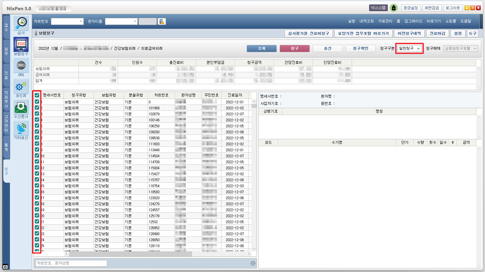 2) 청구구분.[일반청구] 인 경우에도 청구할 대상을 지정할 수 있도록 [명세서번호] 좌측 [선택] 항목 추가