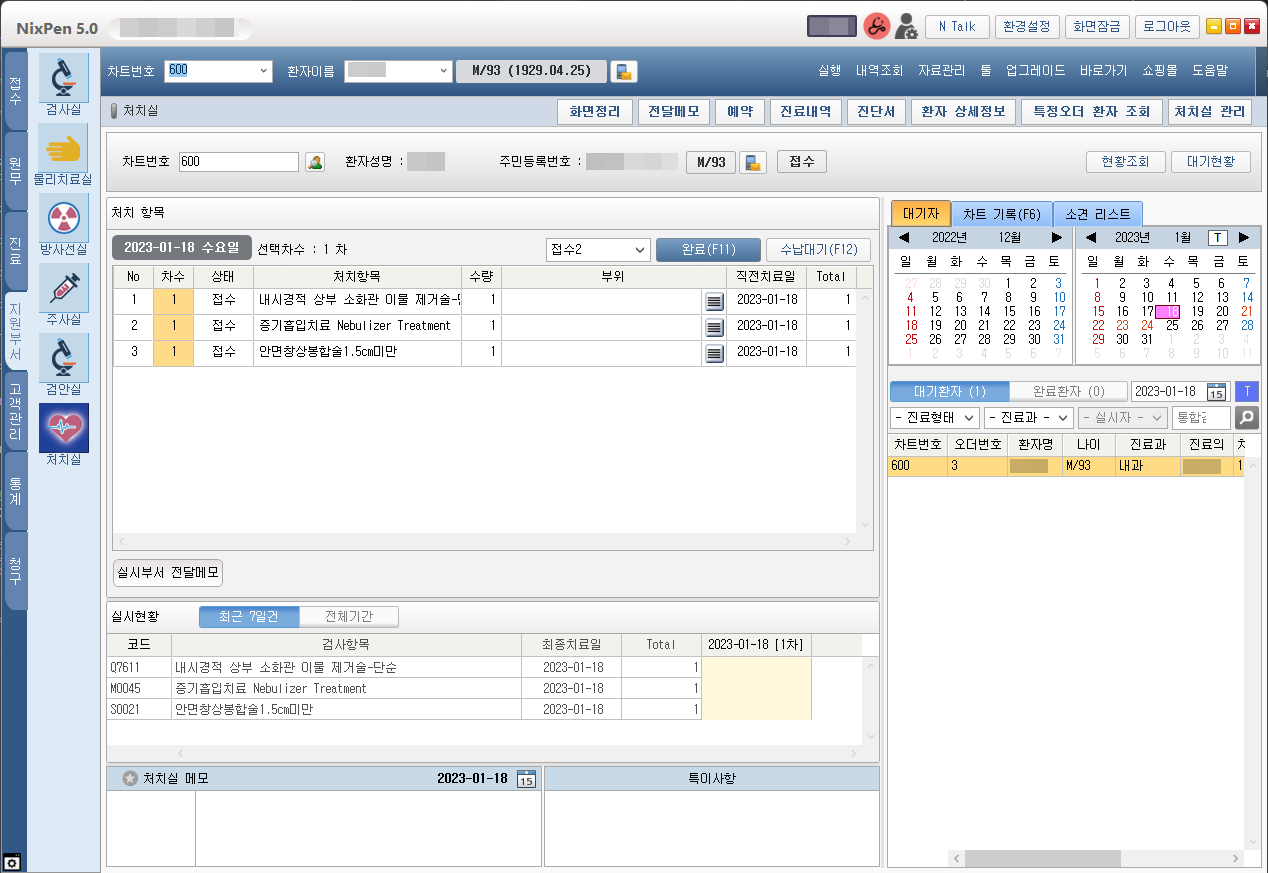 1) 지원부서 메뉴에서 처치실(TREAT) 화면 참조