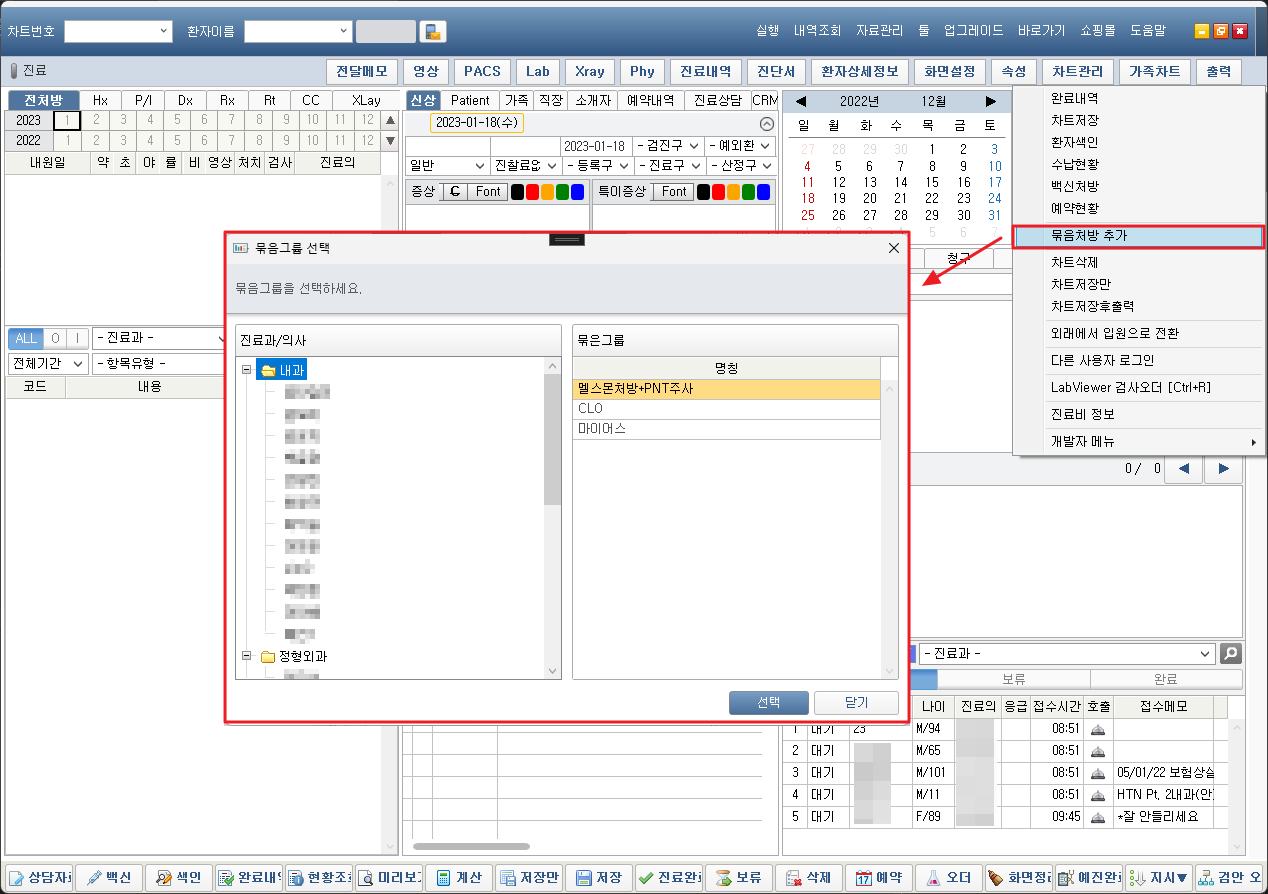 2) 상단 [차트관리] 버튼 Click - [묶음처방 추가] 메뉴 선택