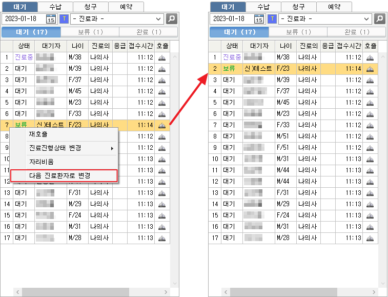 2) 환자 목록 중 [진료대기] 건 Right Click - [다음 진료환자로 변경] 메뉴 선택