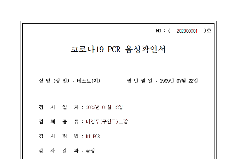[ 코로나19 PCR 음성확인서 서식 출력물 화면 ]