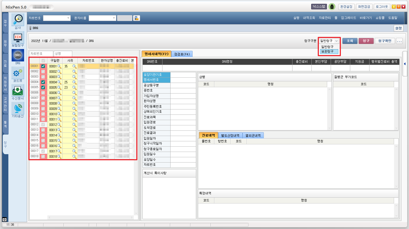 5) 대상 청구 목록 선택 후 [구일련] 및 [사유] 항목 입력