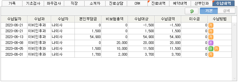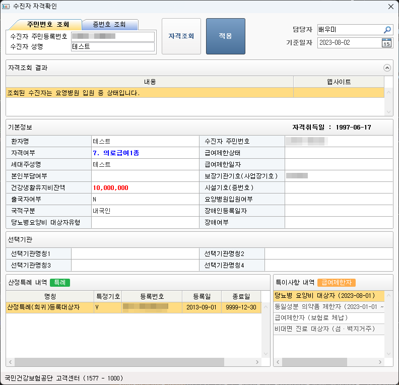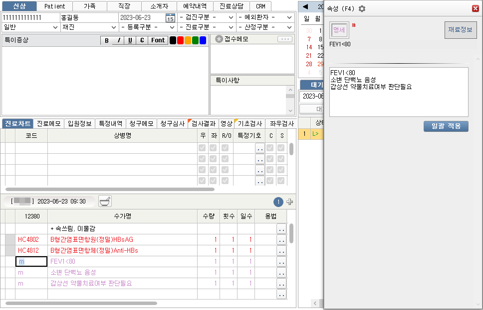 - 로그인 사용자로 진료 의사 가 변경되며, 당일 자격 조회 기준 보험 유형, 산정 기준 초재진 구분 이 적용됩니다.