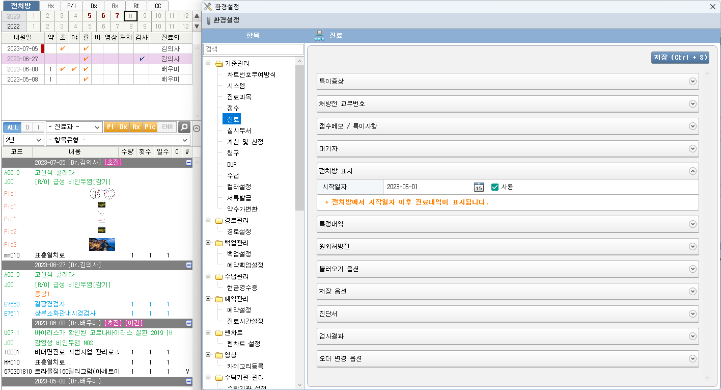- 진료 환경 설정에서 전처방 숨김 기능 사용, 전처방 표시 시작 일자 옵션을 설정합니다.