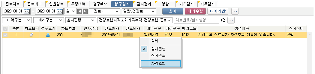 - 심사 - 자격 조회 누락 또는 오류가 발생한 경우 심사 우클릭 시 자격 조회 할 수 있도록 메뉴 추가