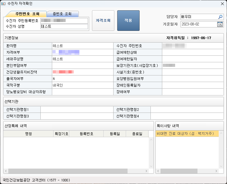 - 자격 조회 시 ① 섬·벽지 거주 여부, ② 65세 이상 장기요양 등급 판정 여부, ③ 장애인 여부 를 확인할 수 있습니다.