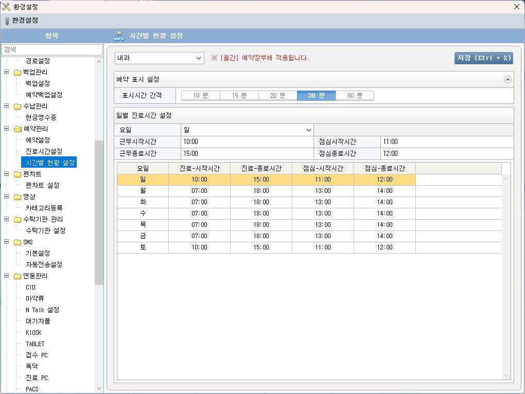 ▼ 시간 별 현황 설정 창에서 과 별 표시 시간 간격, 요일 별 진료 시간 을 설정합니다.