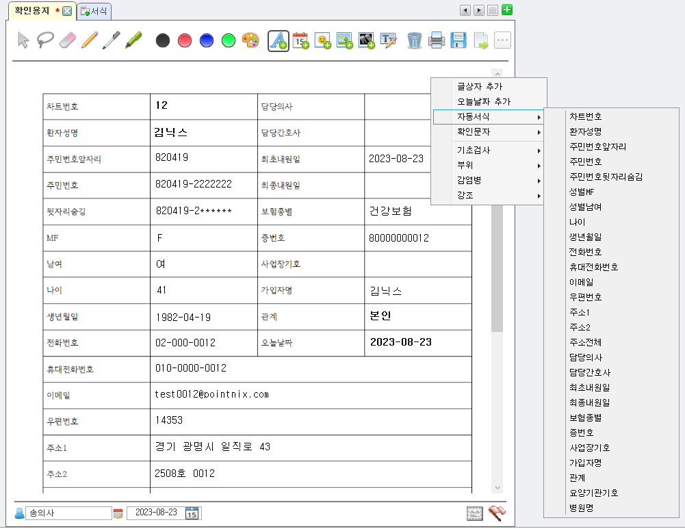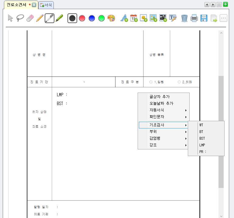 - 환자 불러오기 후 펜차트 작성 화면 우클릭 시 자동 서식 이 표시됩니다.
