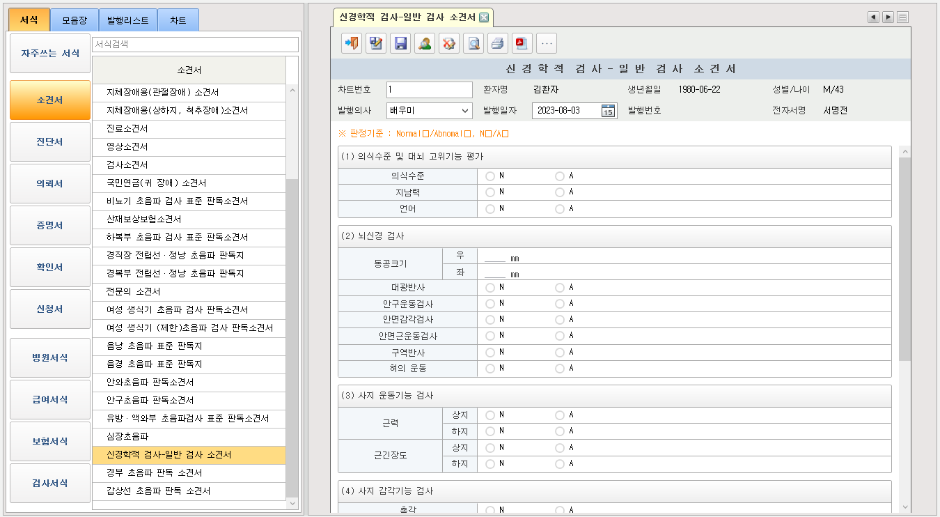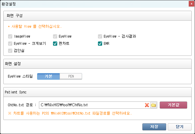 - 환경 설정에서 화면 구성 펜차트, EMR 설정 시 펜차트 기록을 작성 및 조회할 수 있습니다.