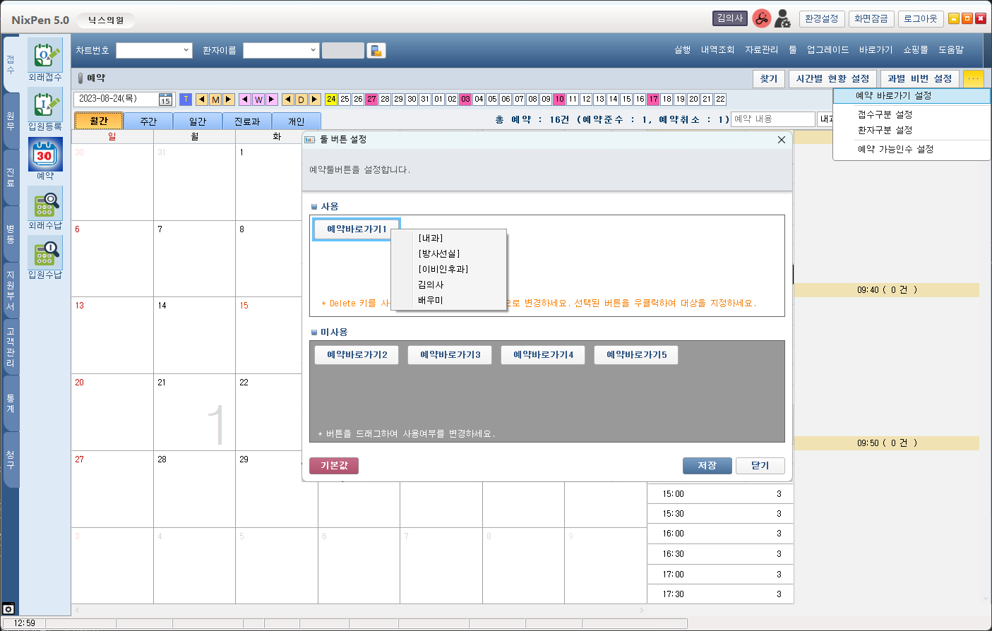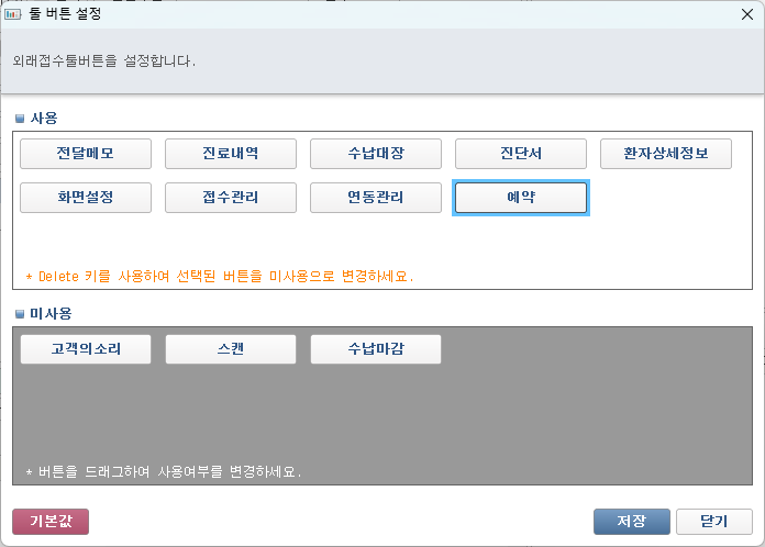 - 접수 및 진료 화면에서 예약 툴 버튼을 설정합니다.