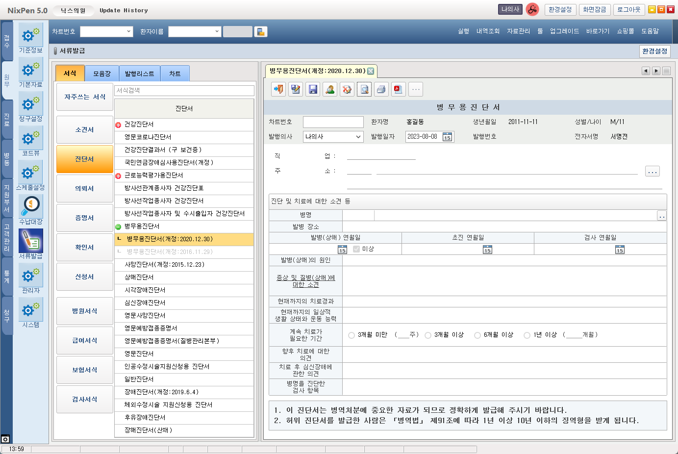 - 자동 서식 중 필요한 환자 정보, 병원 정보 를 서식지에 위치시킵니다.