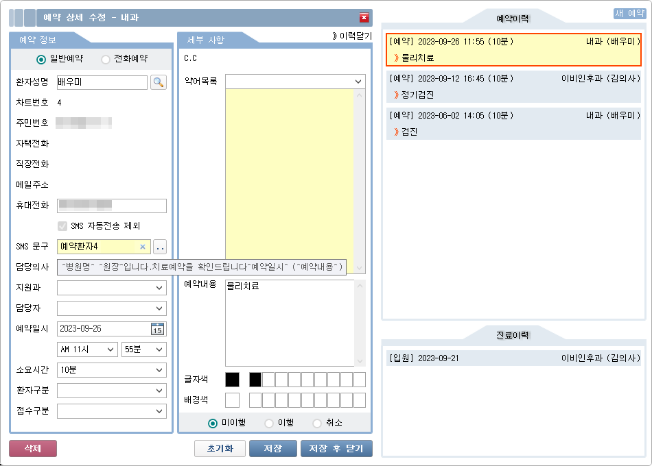 - 원무 - 예약 시 SMS 전송 문구 개별 설정 기능 추가
