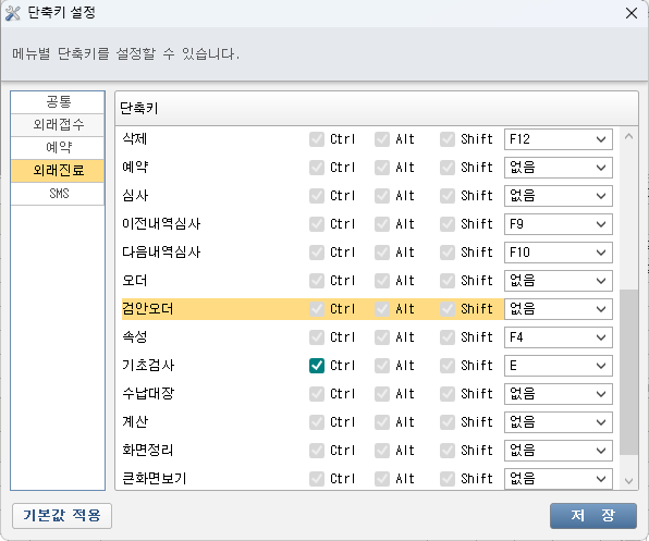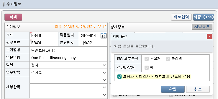 - 수가 정보 화면에서 초음파 시행의사 면허번호에 진료의 적용 처방 옵션을 설정합니다.