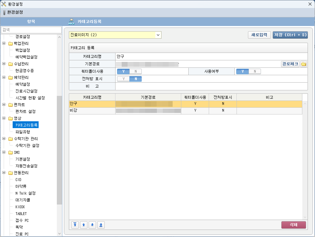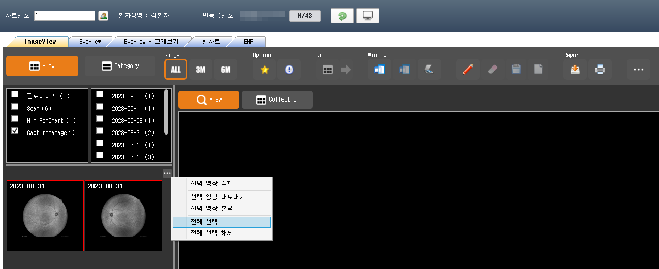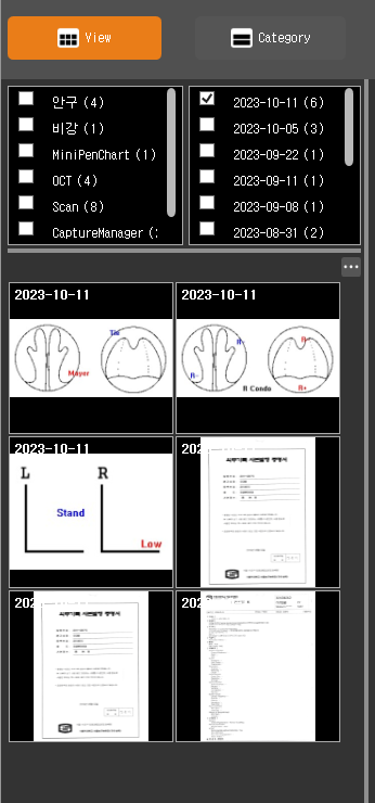 - 환자 불러오기 시 설정한 옵션 기준으로 카테고리 및 썸네일 목록이 나열됩니다.