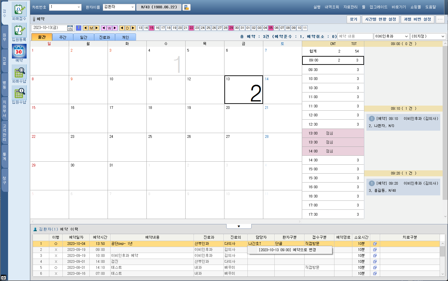- 예약 내역 우클릭 시 현재 예약 장부에서 선택된 일자, 시간으로 즉시 예약을 변경할 수 있도록 메뉴가 표시됩니다.