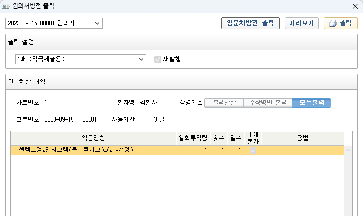 - 원무 - 처방전 출력 창에