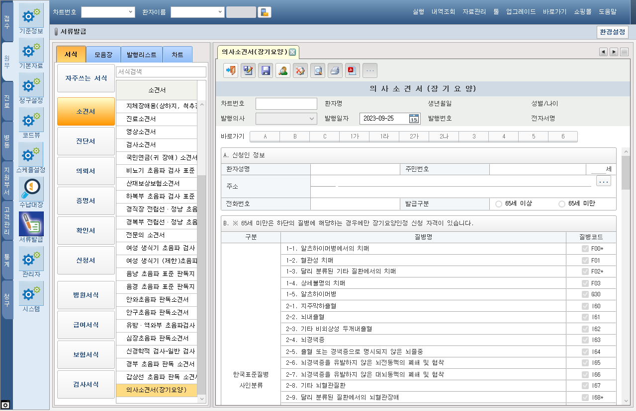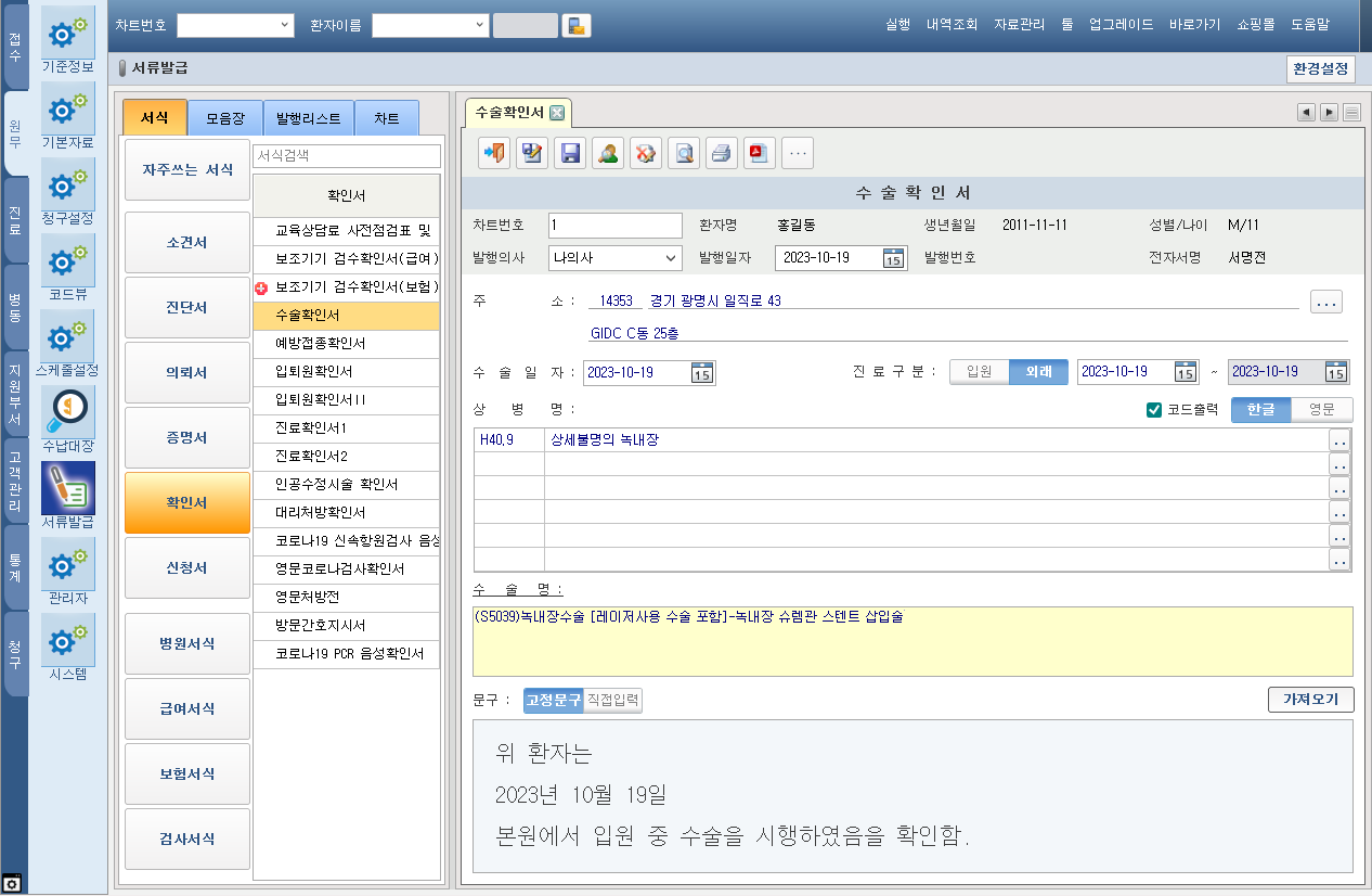 일반 진단서, 입퇴원 확인서(I, II), 수술 확인서 서식 일자 직접 편집 기능 지원